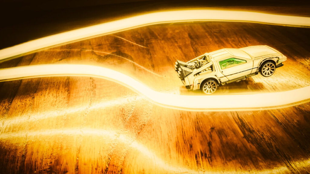 Na fotografia da miniatura do carro DeLorean, do filme “De volta para o futuro”, coloquei um objeto sob o carro para erguê-lo e desenhei com a lanterna do celular.