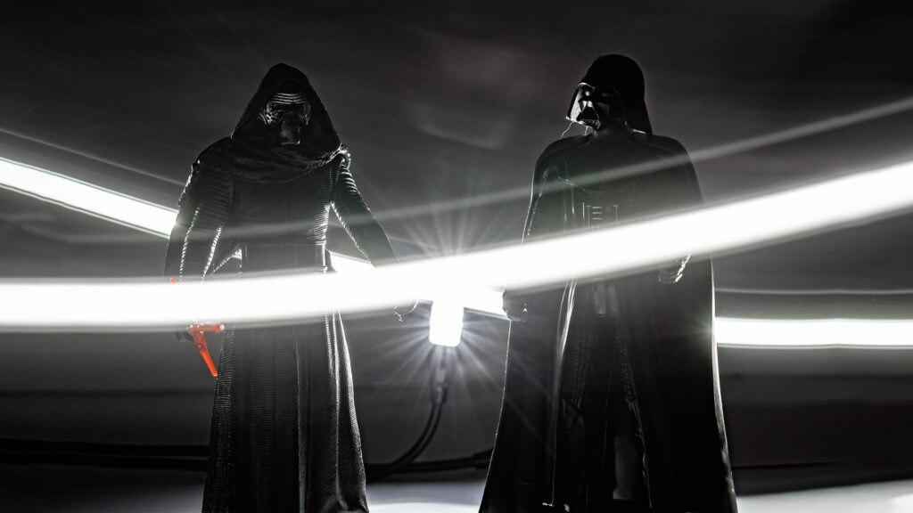 Outro exemplo é a imagem das miniaturas do Darth Vader e Kylo Ren, onde utilizei uma luz LED ao fundo enquanto mantinha o obturador aberto e desenhava com a lanterna do celular.